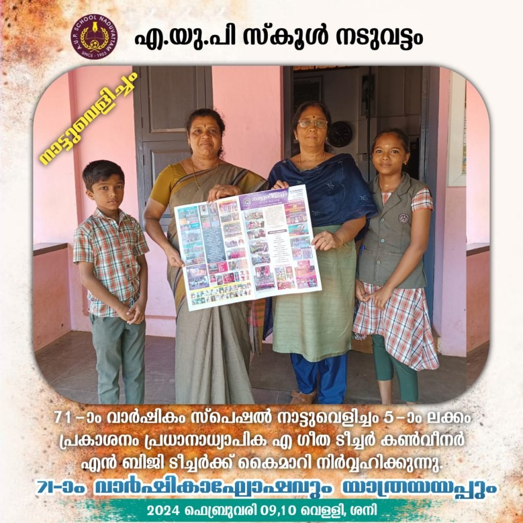 71-ാം വാർഷികം സ്പെഷ്യൽ നാട്ടുവെളിച്ചം അഞ്ചാലക്കം പ്രകാശനം, പ്രധാന അധ്യാപിക എ ഗീത ടീച്ചർ കൺവീനർ എൻ ബിജി ടീച്ചർക്ക് കൈമാറി നിർവഹിക്കുന്നു.